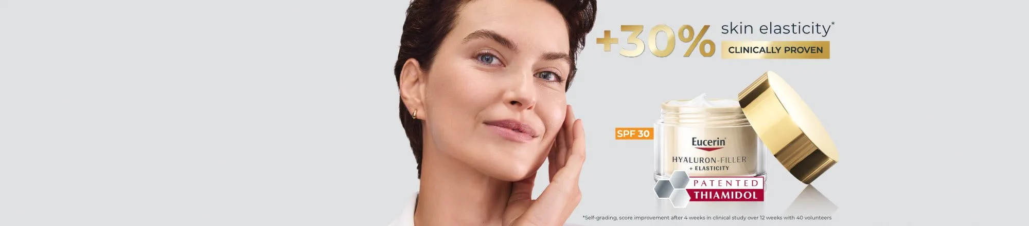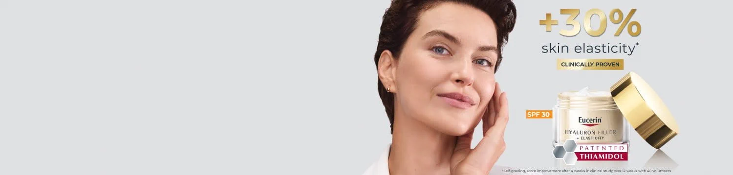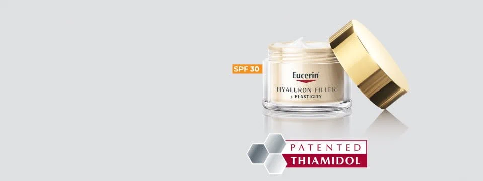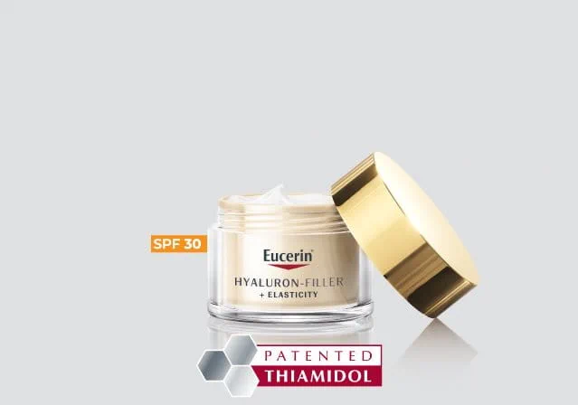 Eucerin Hyaluron-Filler + Elasticity has been specially formulated to reduce deep wrinkles and age-spots, enhance skin’s elasticity and radiance. Eucerin’s innovative blend of both high and low molecular Hyaluronic Acid visibly plumps deep wrinkles from within, while a powerful combination of Arctiin & Creatine (Collage-Elasti Complex) re-energises collagen production and increases skin’s elasticity. Finally, the clinically proven Thiamidol reduces the appearance of age spots with the first visible results in 2 weeks.